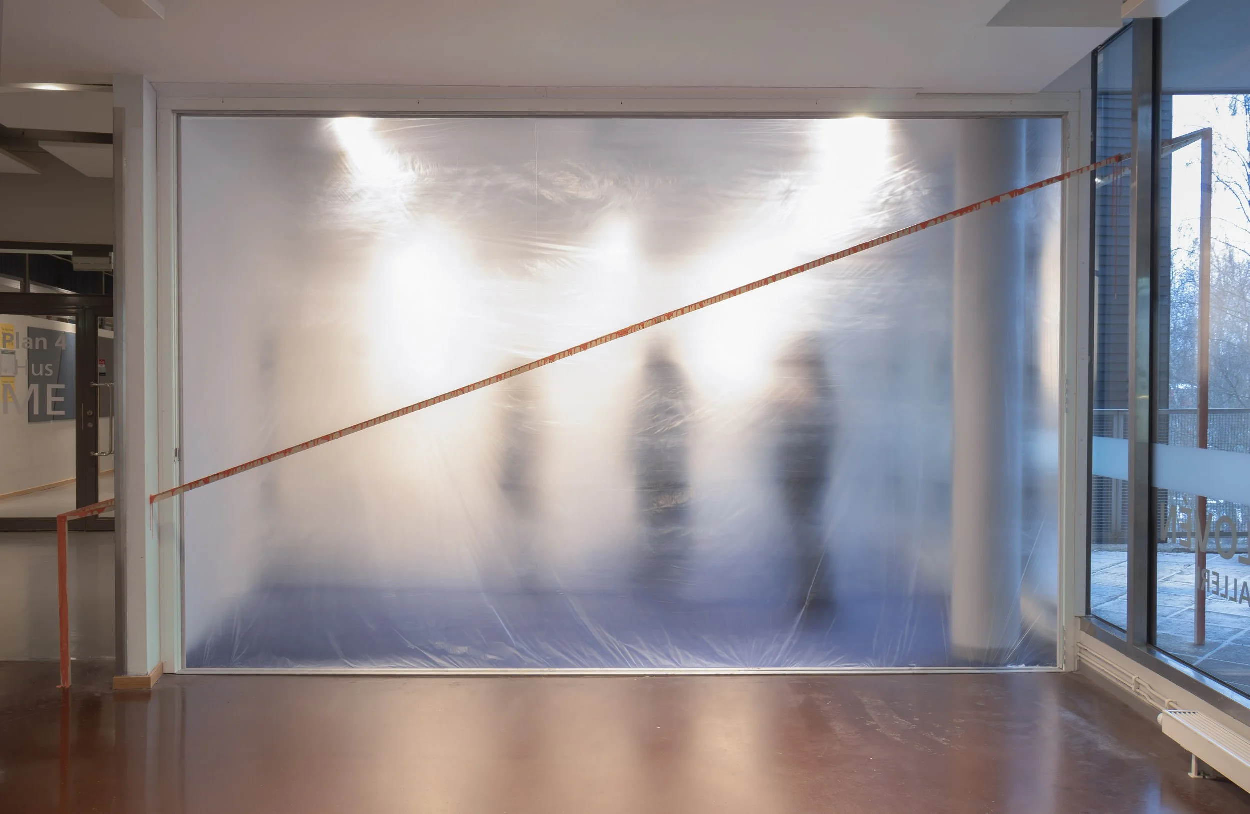 “Synthesis” is the site-specific art installation that consists of semi-transparent plastic sheets, coloured mosquito nets, white rope and colour on the walls. The installation elements are placed in an engaging way with the already two existing, dominant neighbour walls in the room. The installation plays with the meaning of the existing room architecture: between the walls there is a gap, but the installation elements are placed in a way that interact with the existing elements of the room. Placement of the installation elements engages the viewer to look at the separated walls as a whole: positioning the plastic sheets in a way that defines the width and the height of the installation. By hanging them from the ceiling, they are treated as curtains and in this way the viewer gets the feeling of a vertical direction of the artwork, especially within the wall gap where the full length of the “curtains” is emphasised. One light is placed behind, at the bottom of the curtain, which opens another vertical communication between the bottom and the existing ceiling lights.