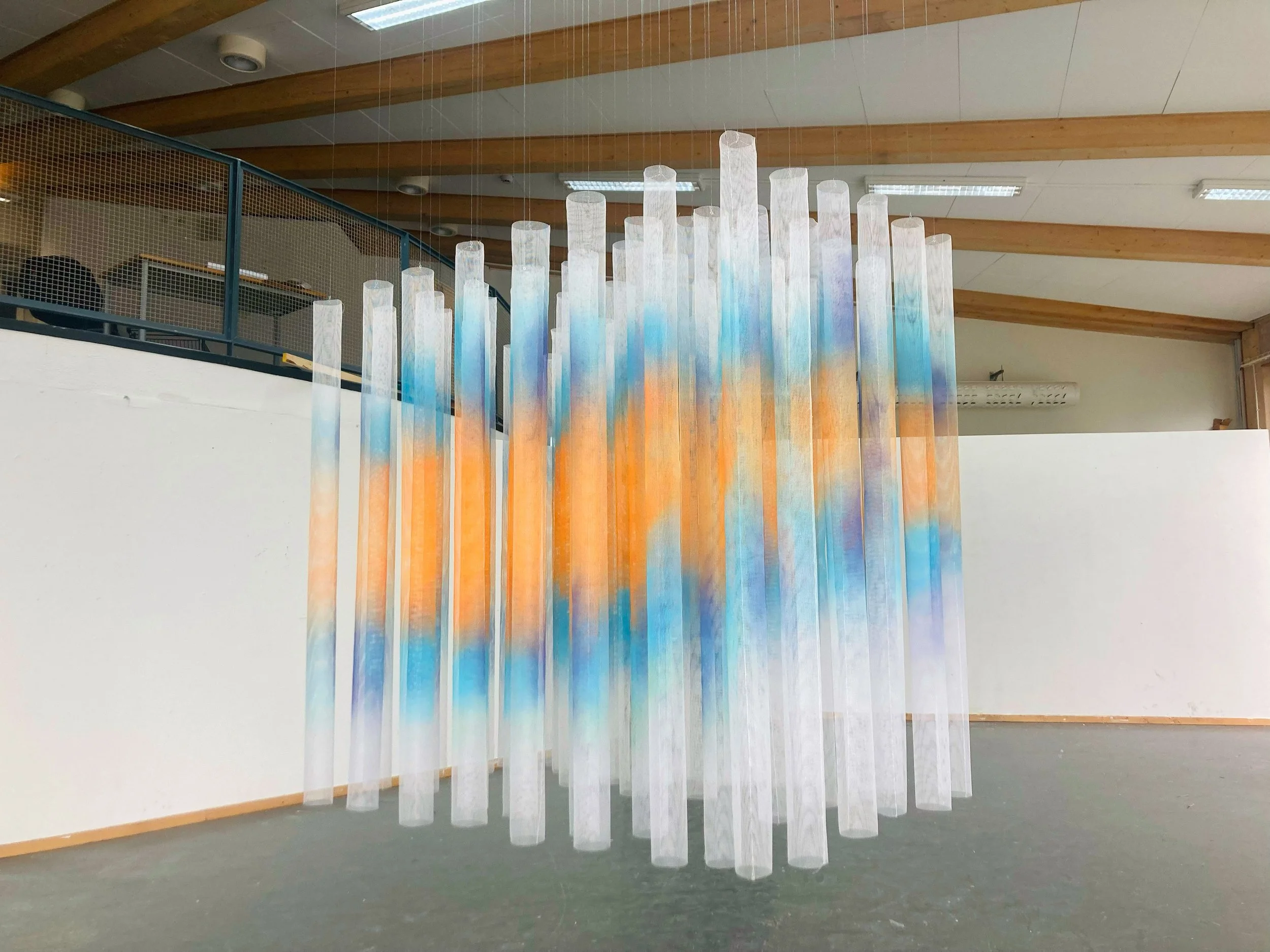 Vertical Field arranges a colored mosquito net into a vertical field within the space. Translucent elements interact with color and light across repeated surfaces, producing subtle optical variation as the viewer moves.